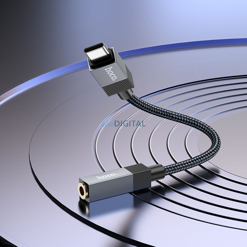 Adaptor Hoco cu un cablu de la USB-C la mufa pentru căști Mini Jack de 3,5 mm. Vă permite să conectați căștile la smartphone-ul dvs. O soluție practică pentru dispozitivele care au doar port USB-C.