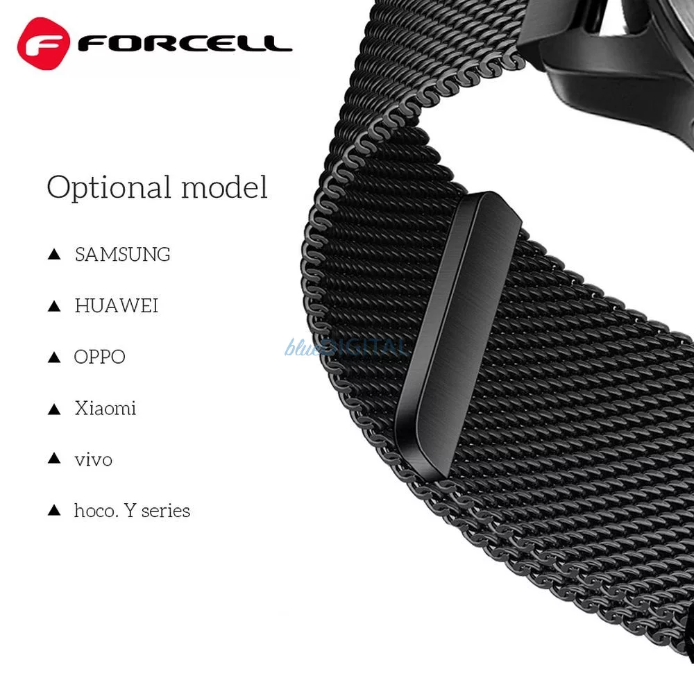 Cureaua Forcell F-Design FS11 este o brățară elegantă, în stil milanez, proiectată pentru ceasurile Samsung Galaxy Watch, dar se potrivește și altor modele telescopice cu lățimea de 22 mm.