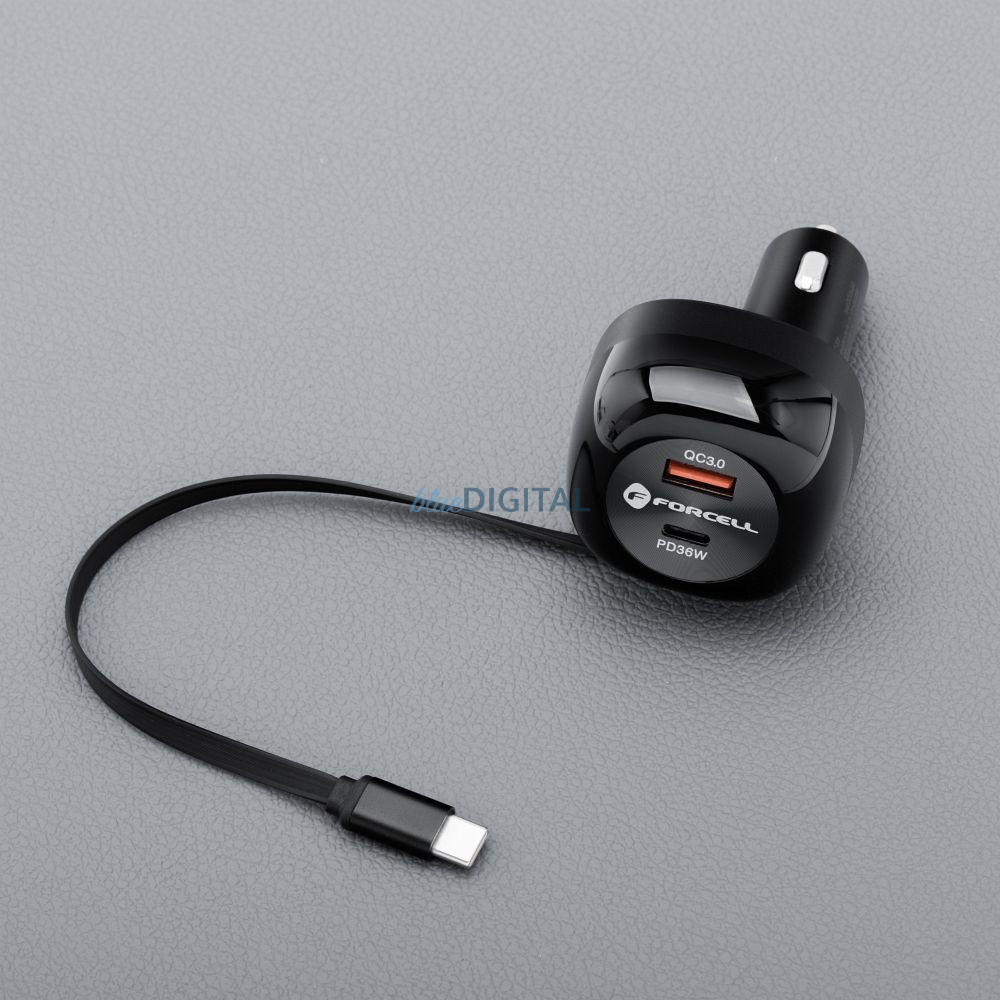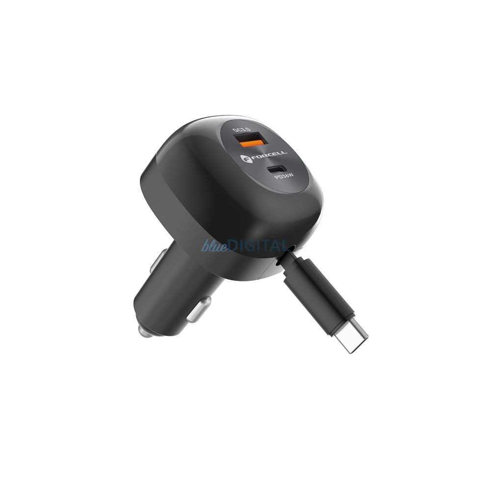 FORCELL F-ENERGY Încărcător auto din aluminiu cu cablu retractabil tip C și tip C + mufă USB-A PD QC4.0 SFC2.0 3A 75W negru