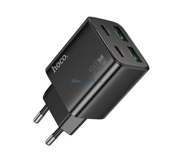 HOCO N55 Încărcător AC 2 USB+2 prize Type-C (20W, GaN, PD fast charger 3.0) NEGRU