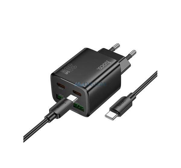 HOCO N56 încărcător de putere 2 USB+2 prize Type-C (30W, GaN, PD fast charger 3.0 + cablu Type-C) NEGRU