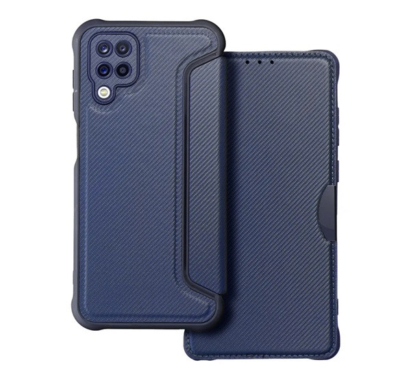 HUSĂ! - Husă în picioare, efect piele (FLIP, deschidere laterală, colț cu pernă de aer, protecție pentru cameră, model carbon) ALBASTRU ÎNCHIS Samsung Galaxy A12 (SM-A125F, SM-A127F)