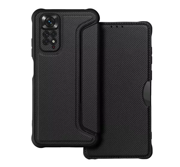 HUSĂ! - Husă stativă, efect de piele (FLIP, deschidere laterală, călcâi cu pernă de aer, protecție cameră, model de carbon) negru Xiaomi Redmi Note 11 4G (Redmi Note 11S)