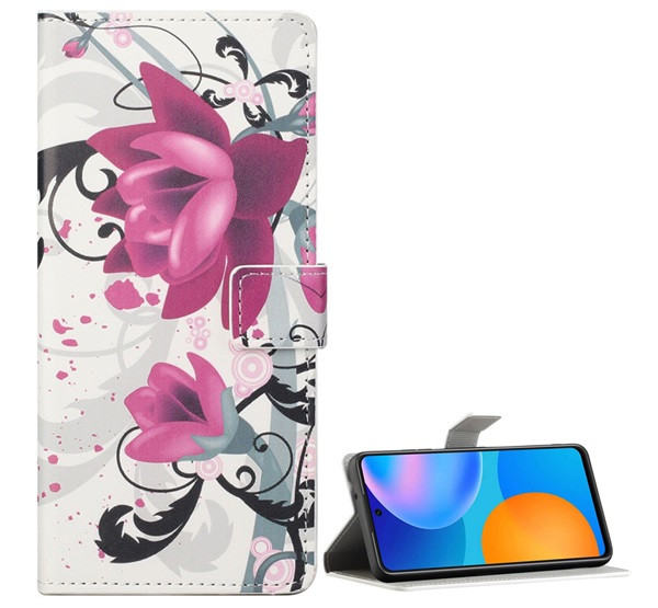 HUSĂ! - Husă stativă, efect piele (FLIP, deschidere laterală, suport pentru birou, model floare de lotus) alb Huawei P Smart (2021)