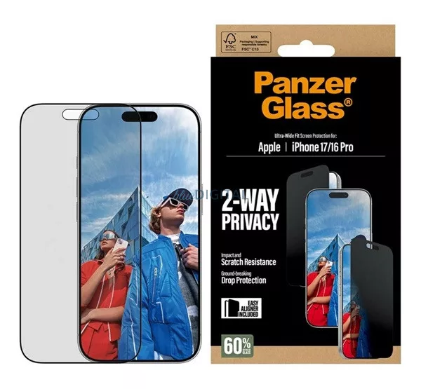 PANZERGLASS 2-WAY PRIVACY ULTRA-WIDE EASYALIGNER ecran protector de sticlă (anti-orbire, rezistent la zgârieturi + cadru) BLACK Apple iPhone 17, iPhone 16 Pro