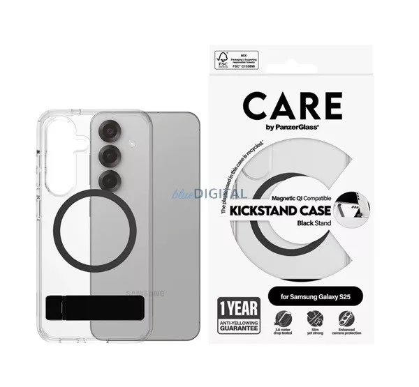 HUSĂ! - PANZERGLASS CARE KICKSTAND CASE silicon telefon protector (rezistent la șocuri, aparat de fotografiat protector, magnetic, wireless, kickstand) BLACK Samsung Galaxy S25 (SM-S931)