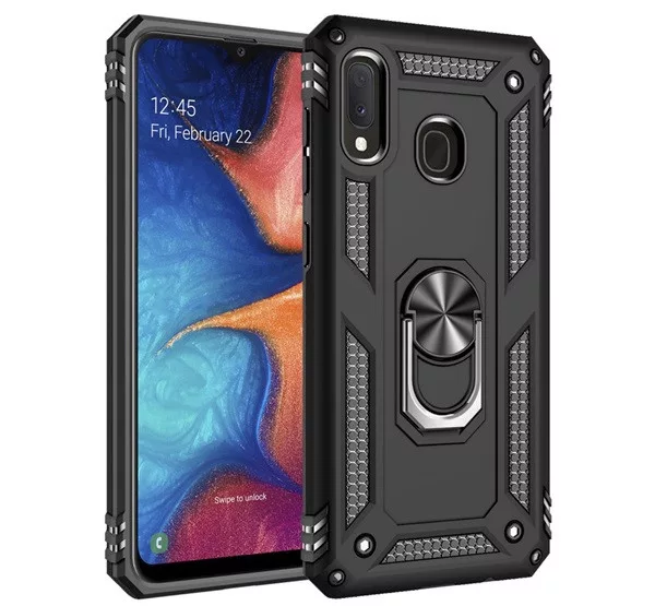 HUSĂ! - Protecție din plastic pentru telefon Defender (rezistentă la impact mediu, interior din silicon, inel suport telefon, placă metalică încorporată) negru Samsung Galaxy A20e (SM-A202F)