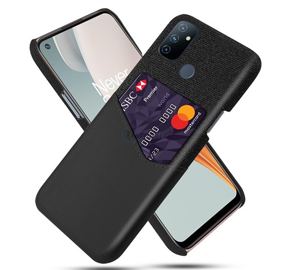 HUSĂ! - Protectie din plastic pentru telefon (rezistenta medie la impact, suport card bancar, invelis textil, spate cu efect piele) NEGRU OnePlus Nord N100