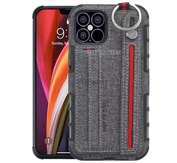 HUSĂ! - Protectie din silicon pentru telefon (rezistenta medie la impact, functie suport de masa, suport card bancar, spate textil + curea de la mana) GR Apple iPhone 12 Pro, Apple iPhone 12