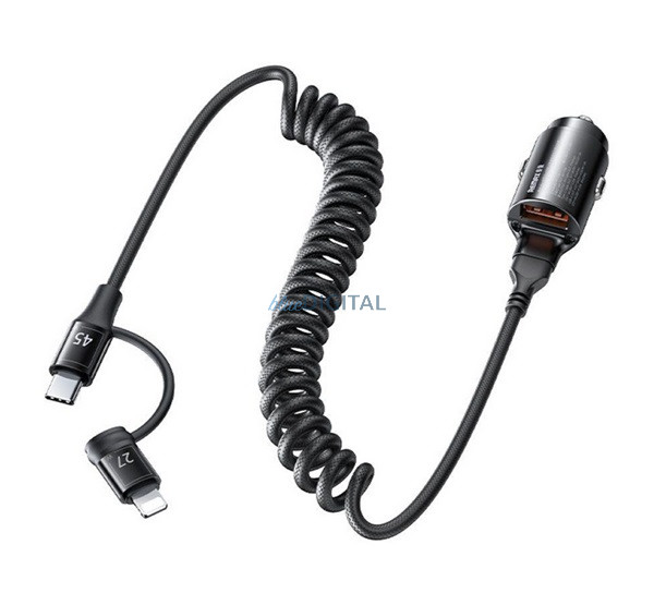 REMAX RUICHY încărcător auto priză USB (45W, încărcător rapid PD + bobină fixă Type-C - cablu Lightning) NEGRU