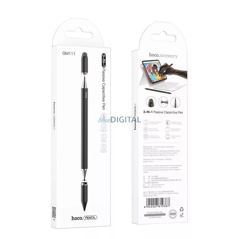 Stiloul pasiv pentru tabletă 3in1 Hoco GM111 este un dispozitiv versatil care combină funcționalitatea unui stilou cu ecran tactil și a unui stilou tradițional. Datorită penițelor sale interschimbabile, acesta poate fi utilizat atât pe ecranul dispozitivelor electronice, cât și pe hârtie.