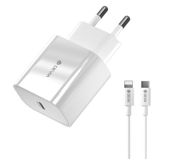 Încărcător DEVIA SMART V2 priză tip C (20W, încărcător rapid PD + cablu fulger) ALB